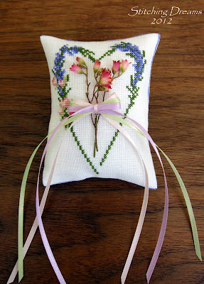 Finally, another freebie finish called "Lavanda" by Luli which can be found right here. For this finish (stitched with the suggested DMC colors on 40 ct. white Newcastle linen), I did something a bit different. I sewed a small loop of pink ribbon in the middle, added a trio of pastel bows, and placed a bouquet of tiny flowers inside the ribbon. Ideally, these would be dried lavender, but not having any right now, I simply inserted a few sprigs of pink coral bells for the photo. What do you think?