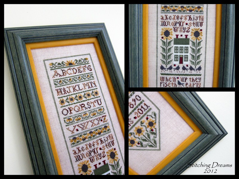 This next piece is one I stitched in 2011 when I received it as a RAK from my sweet friend, Brenda. Do you remember "Sunflower Bellpull" by The Drawn Thread? If you'd like to read more about it you can click here. I think this remains one of my all-time favorite stitched pieces. And just look at the frame! The framer came up with the two-toned idea and it just made the whole piece pop! I would never have thought of using two colors like that, but don't they look perfect with the colors in the sampler?