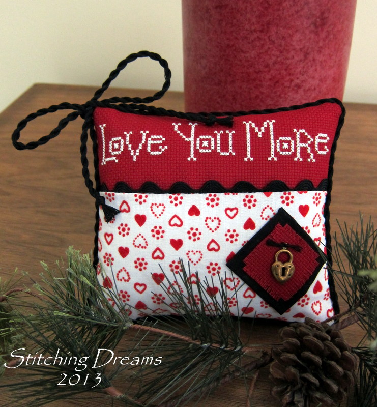 When I first saw this love-letter carrying little bird, I fell in love with him! He is a freebie designed by the very creative Luli which you can find right here. He is part of a larger design of four birds, but you know me and my love of smalls--I decided to stitch him all by himself. He just looks so sweet flying his Valentine to someone's true love, doesn't he? This design is stitched on 40 ct. pearl gray Newcastle with a variety of overdyeds and is finished with some white satin ruched ribbon and pearly white pins. I slightly changed the bird's body and then added the three little red hearts in the front. Every time I look at him, I just want to say--you are SO cute (well, actually, I do say that!).