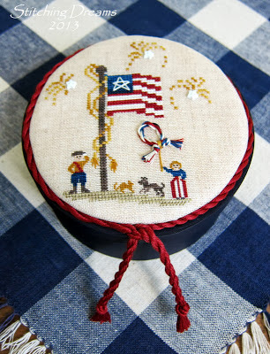 I've noticed that many of you have been stitching patriotic pieces this time of year and I'm joining the crowd. I think that after Christmas ornament stitching, patriotic is my favorite theme. I only had time to add a couple of new things to my ever-growing collection of red, white, and blue stitching, but I'm really happy with how they both turned out. First up, is this little scene from an old issue (Summer 2002) of Fine Lines magazine. I couldn't seem to get a good photo of the stitching itself, so you'll have to trust me on just how cute this one stitched up. The flag, grass, and fireworks are stitched over two on a 32 ct. mystery linen. The people and animals are stitched over one--so tiny and detailed! I didn't have any of the suggested colors so I simply substituted them with similar overdyeds. The ribbon/kite-like thing that the girl is waving was made by twisting some red, white, and blue DMC into cording and simply tacking it down with some gold floss.