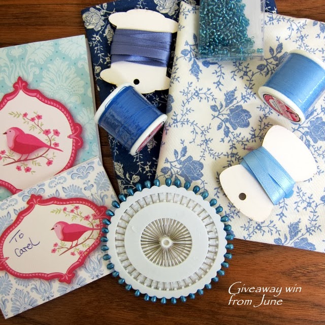 My mail man was kept busy this past week with deliveries arriving from England, Portugal, and Connecticut. My package from England came from my dear friend, June. I had won her giveaway way, way back in April and we both feared the package had been lost at sea or something! She mailed it on May 2nd and it took seven long weeks to arrive. Can you believe it? June was thrilled to hear it finally got here and, believe me, it was well worth the wait. Just look at all the blue and white goodies June sent--fabrics, ribbons, thread, pins, beads! Lovely... There was also some chocolate which had melted into a gooey mess, but did that stop me from eating it? Heavens, no!! I just popped it into the refrigerator until it solidified and then popped it right into my mouth--delicious! Thanks you so much, June--everything is so lovely!